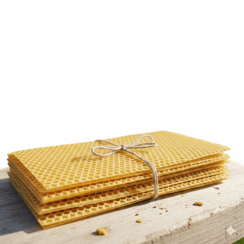 La cera estampada es una lámina de cera de abeja con un patrón hexagonal grabado, que sirve como base para que las abejas construyan sus panales.
